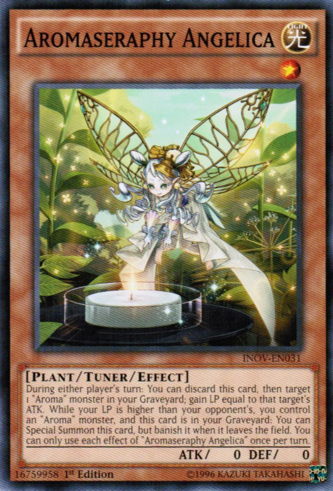 During either player's turn: You can discard this card, then target 1 "Aroma" monster in your Graveyard; gain LP equal to that target's ATK. While your LP is higher than your opponent's, you control an "Aroma" monster, and this card is in your Graveyard: You can Special Summon this card, but banish it when it leaves the field. You can only use each effect of "Aromaseraphy Angelica" once per turn.